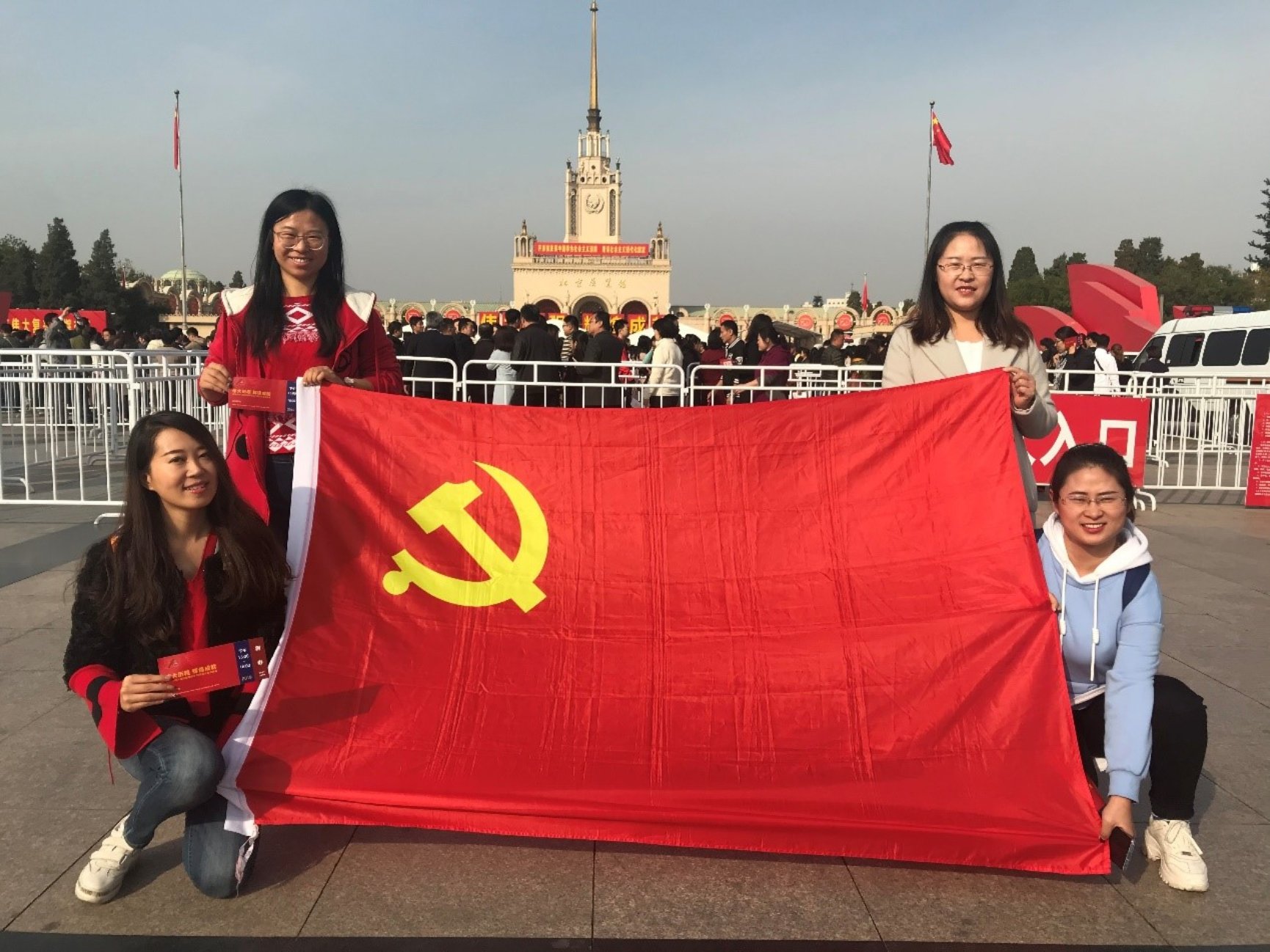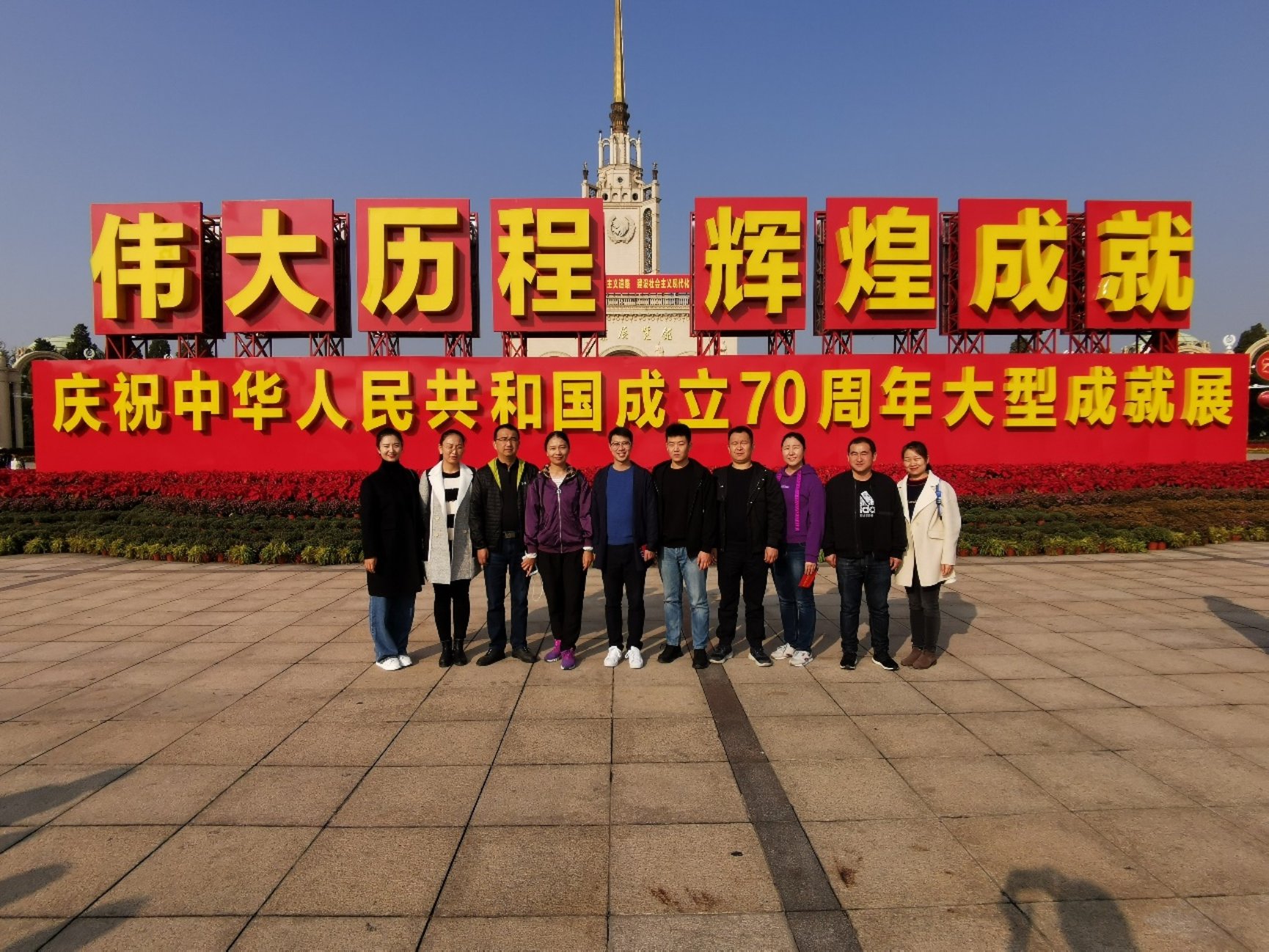 在参观活动结束后,同学们聚集在北京展览馆广场“庆祝中华人民共和国成立70周年大型成就展”巨幅展板前同党旗合影留念,同学们也纷纷分享了自己的感受和对祖国的祝愿。