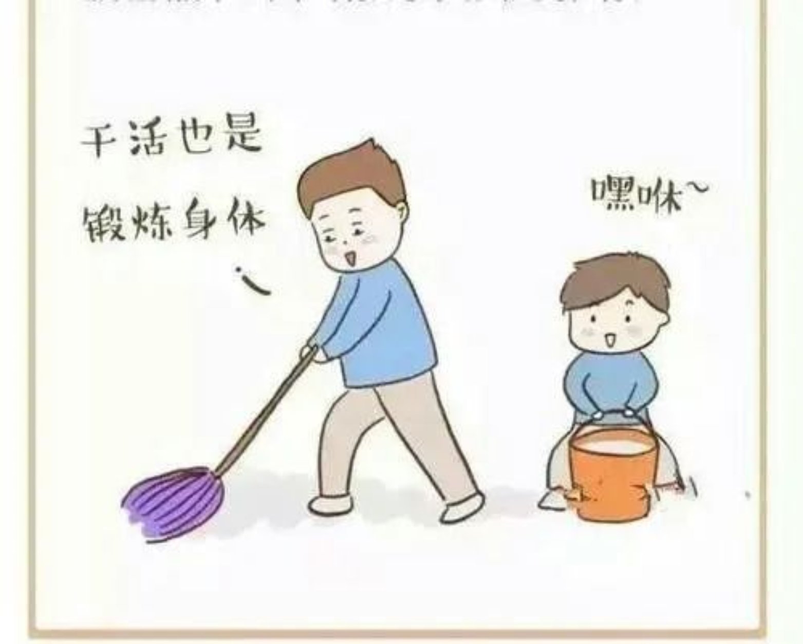 最后,为大家推荐最接地气的锻炼方式:做家务。拖地、扫地可以有效的活动肩关节、髋关节以及脊柱的旋转与屈曲能力,把家⾥的客厅、卧室、厨房、卫⽣间全部打扫⼲净,足不出户就能达到锻炼目标。
