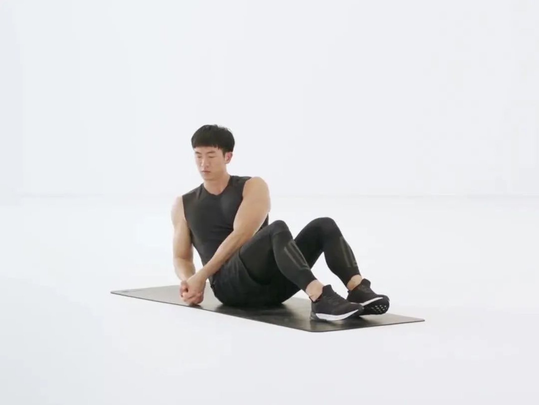 1.坐在垫子上双腿微屈抬起,脚离地,下背挺直,上背略微弓起