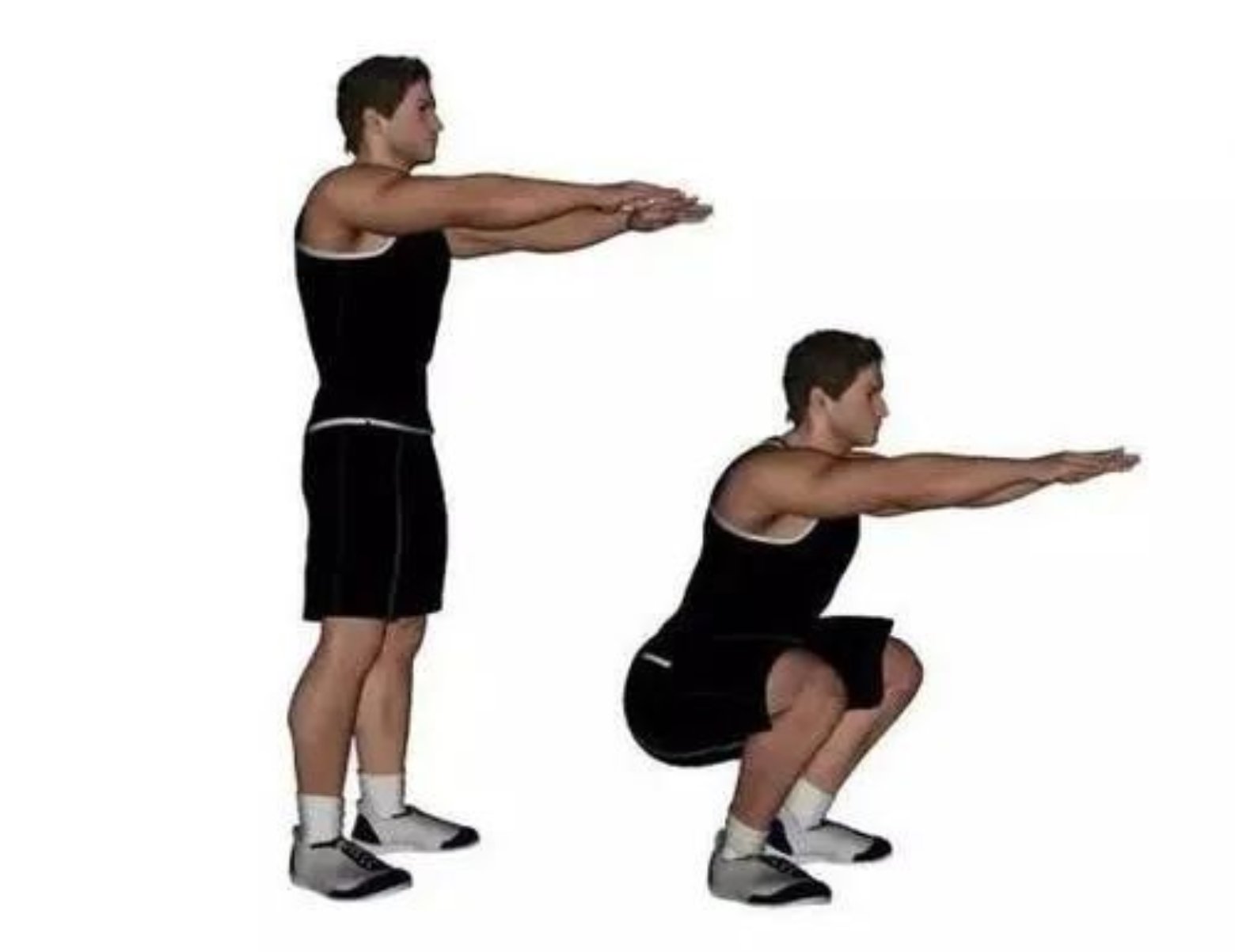1.腰背挺直,脚跟与肩同宽,膝盖与脚尖方向一致,不要内扣,掌心相对,手臂向前平举