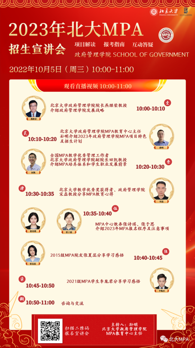 10月5日上午10:00,北京大学政府管理学院2023年MPA招生宣讲会将在云端举行。网报时间已来临,北京大学政府管理学院MPA教育中心将为您详细解读2023年MPA报考要点、全面解答疑惑、扫清报考障碍。