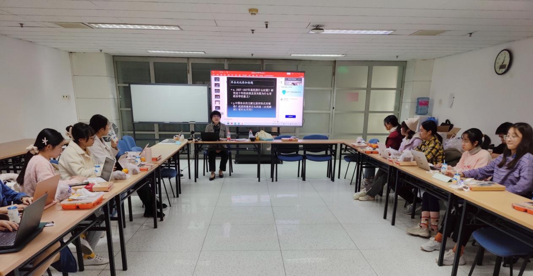 接着金老师将全书内容拆解为18个问题,带领同学们围绕这些问题展开了热烈讨论。本次读书会的主要内容是,第一,金老师强调这不仅是一本水利史的书,更是一本具有政治学意义的书。金老师让大家思考传统中国有哪些体现国家意志和治理行为的工程?在同学回答出修路、邮政驿道等等后,金老师强调了治水在农业国家具有典型和象征意义,水治理在传统农业国家中有绝对重要性;在传统国家向现代国家转型中有特殊重要性;在现代国家治理中有不可或缺的重要性。金老师指出,本书也可视为研究和写作的样本,作者从水利工程的角度讨论国家治理结构问题,从大量档案资料中发现问题,最后提炼出了“工程国家”这一概念。书的写作语言精练、叙事生动,剪裁得当,对于同学以后写论文在各方面都有启发意义。第二,金老师启发同学思考作者为何重点讨论1927年至1937年间国民政府的治淮历程,这十年是南京国民政府的国家能力和资本主义工商业发展最强的时期,但即使这样也未能成功治淮,这更能凸显其制度问题,与新中国的治淮成功形成了鲜明的对比。第三,金老师从“你对中国历史上印象最深的治河人是谁”的提问入手,结合古代潘季驯、近代张謇、现代李仪祉等治水人的事迹,介绍了“分黄导淮”和“束水攻沙”两种传统的治淮思路和首保漕运的政治优先战略。第四,国民政府如何治淮以及为什么没有成功?金老师和同学们一起回顾了南京国民政府导淮委员会、全国经济委员会、救济水灾委员会等机构的建立和功能,分析了在治淮和工业化道路问题上中央政府和地方政府间矛盾、治淮官员的利益纠结、政治局限、技术缺陷、经费局促等治淮失败原因。大家围绕历史上河道管理体制的弊病、工程式治理方式的优缺点、国民政府如何因治淮失败丧失巩固政权的机会等问题进行了热烈讨论。