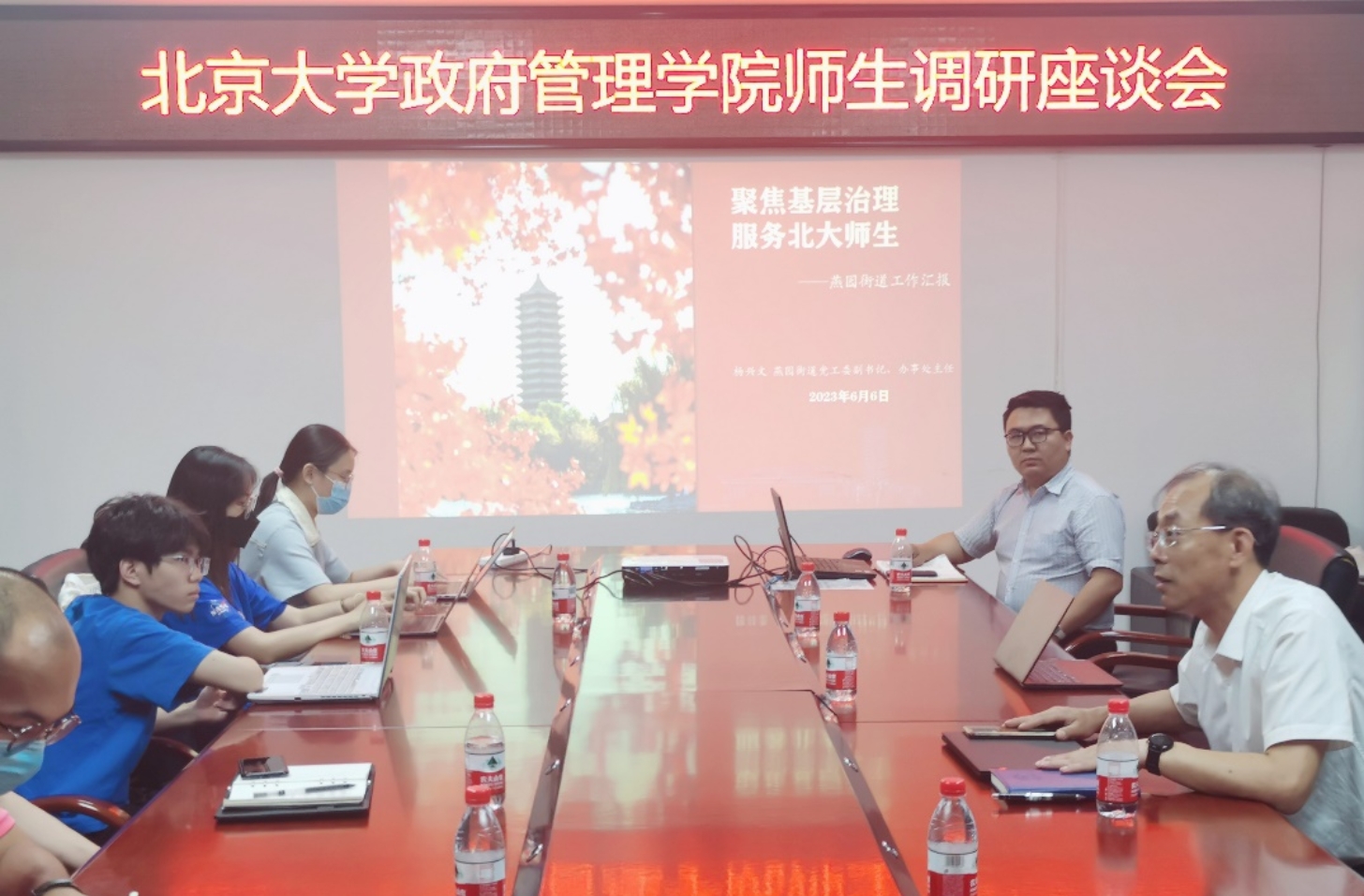 为了增强学生对基层治理认知和理解,2023年6月6日,北京大学政府管理学院《地方政府管理》授课老师万鹏飞带领同学们前往燕园街道办事处开展实践调研活动。燕园街道党工委副书记、办事处主任杨兴文同志和社区建设办公室副主任张晓东同志对同学们的到来表示热烈欢迎。