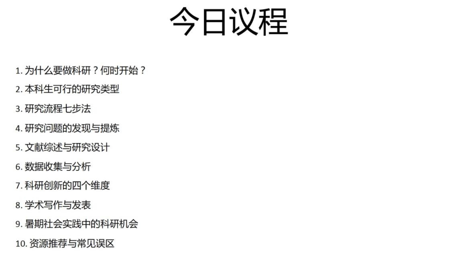 在“本科生可行的研究类型”环节,刘老师展示了个案研究、二手数据分析、小规模问卷或实验、比较历史分析以及系统性文献综述等五种类别,提醒同学根据理论兴趣、数据/资料可得性、方法特长等进行匹配。随后,他详细拆解了“研究流程七步法”——从观察与灵感、提出研究问题、回顾文献并定位理论,到构建假设与研究设计、数据收集与整理、结果分析和可视化,直至写作、修改与分享。