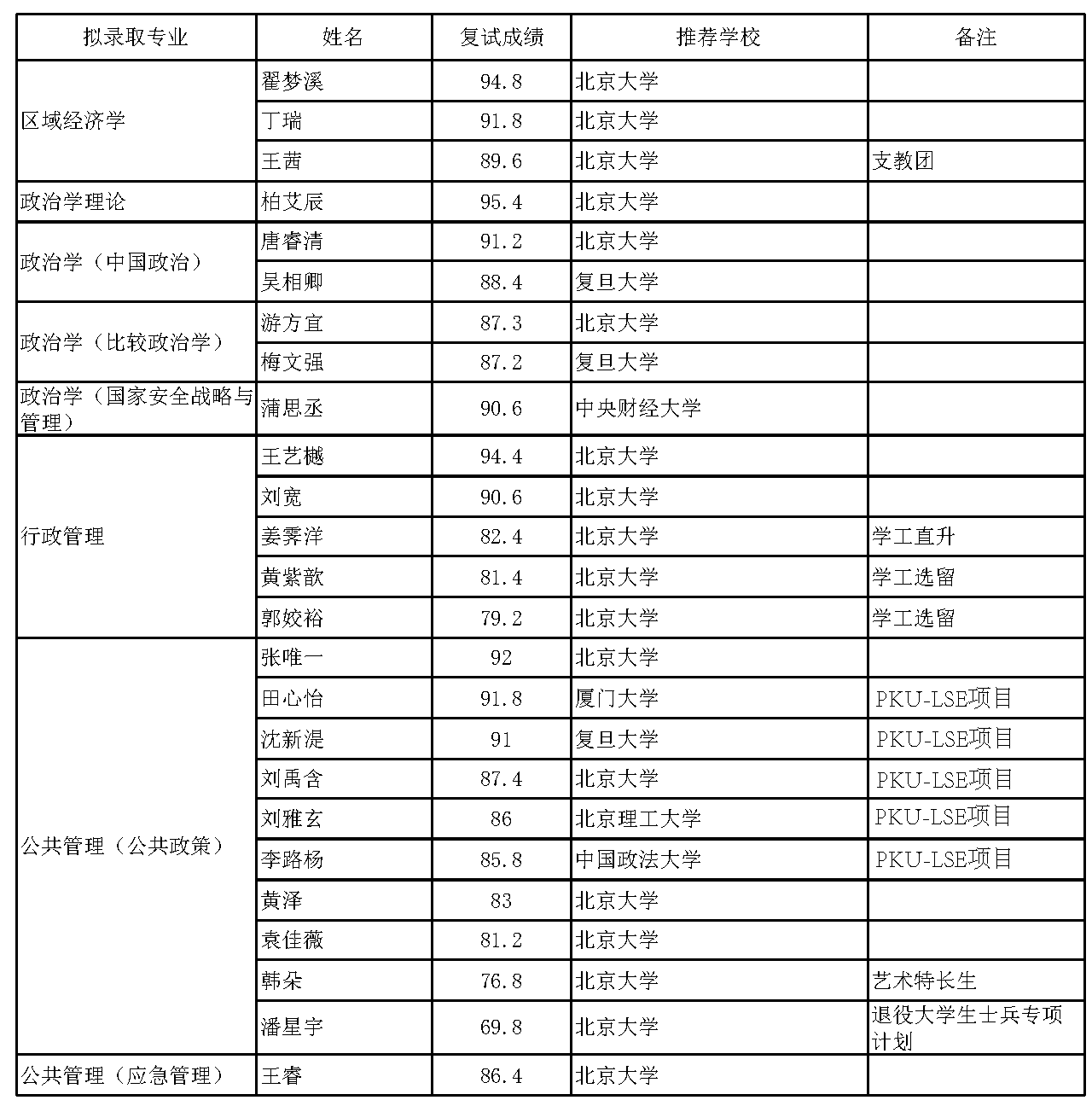 北京大学2021年政府管理学院拟录取推荐免试硕士研究生公示名单
