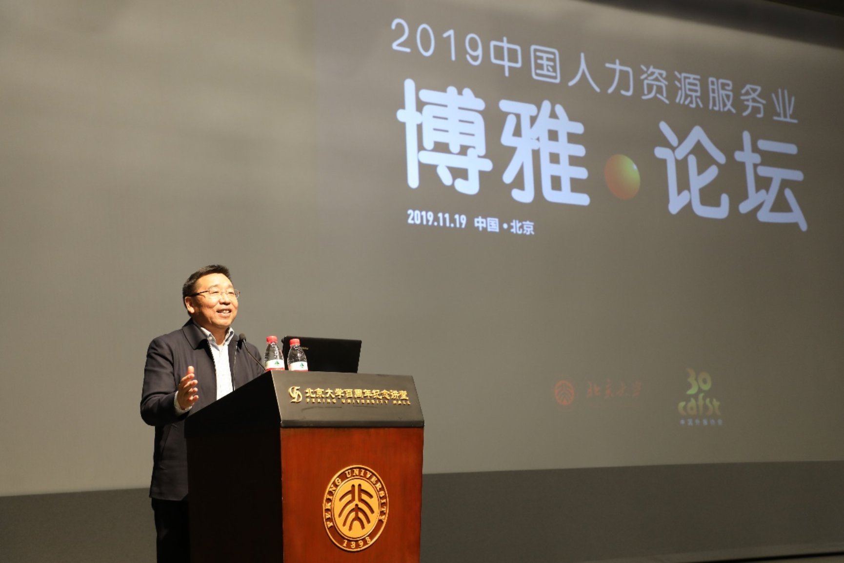 十九届四中全会《决定》第八部分明确指出,要着力健全有利于更充分更高质量就业的促进机制,创造更多就业岗位,健全公共就业服务和终身职业技能培训制度,建立促进创业带动就业。就业与培训服务一直是人力资源服务业中的核心业态,为了贯彻落实十九届四中全会精神,2019年11月19日下午,在我院师生共同努力下,北京大学联合中国对外服务工作行业协会,在北京大学百周年纪念讲堂-李莹厅共同举办2019年中国人力资源服务业博雅论坛。国家人力资源和社会保障部人力资源流动管理司司长孙建立,北京大学王周谊副部长,北京大学人力资源开发与研究中心主任萧鸣政教授,中国对外服务工作行业协会副会长、中智公司总经理王晓梅等来自政界、企业界、学界与媒体界的领导、学者与同仁等近200名嘉宾出席论坛。论坛由中国对外服务工作行业协会秘书长张艳珍主持。