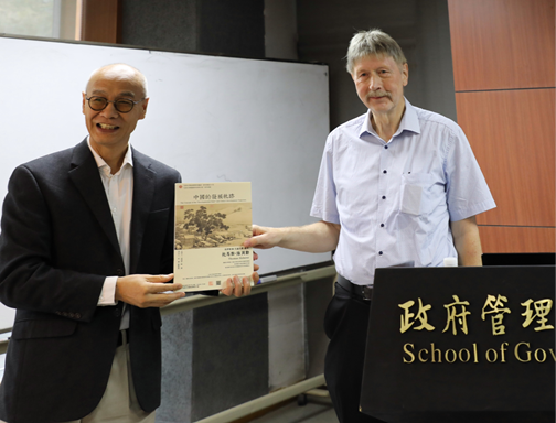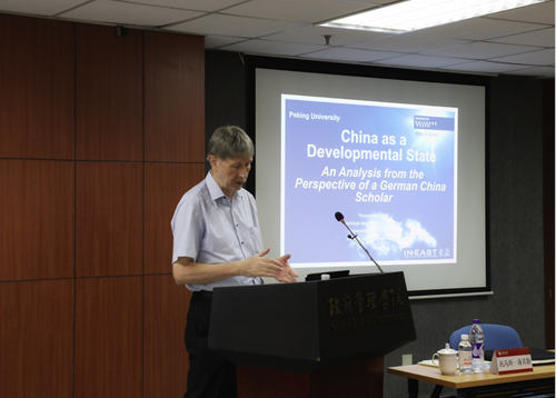 徐湘林教授首先介绍了海贝勒教授的研究经历,并在讲座正式开始前向海贝勒教授赠送了纪念品。 海贝勒教授首先用中文介绍了自己在中国工作和生活的经历,随后用英文发表了题为“The Concept of the Developmental State and China’s Development trajectory”的演讲。