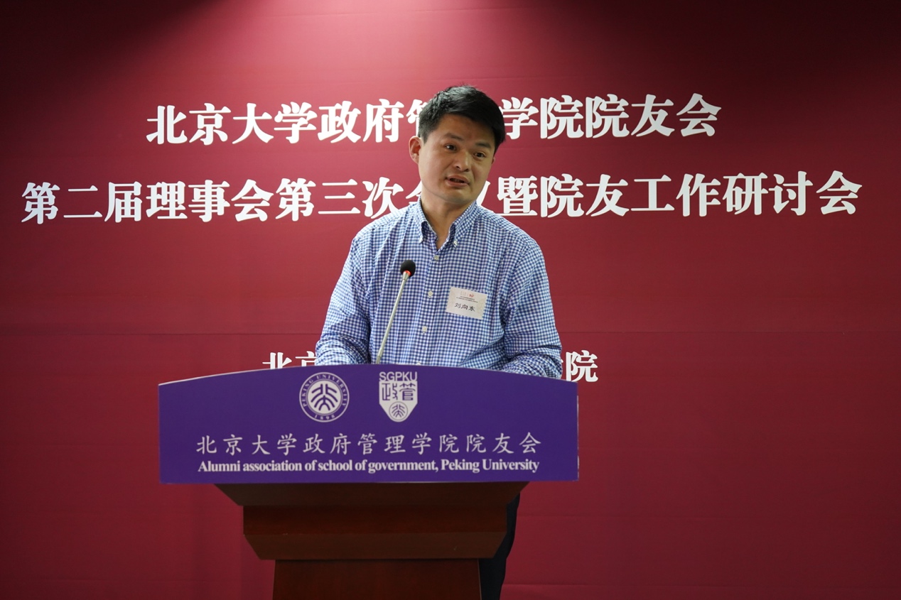 北京大学政府管理学院院友会第二届理事会副秘书长刘向东院友作为代表进行讲话,他对院友工作提出了几点自己的看法。他认为院友作为重要力量应对学院、学校以及社会发展起到关键性作用。在新的经济发展形势下,院友会要加强工作水平,通过院友会途径紧跟新形中国发展新形势。同时刘向东院友希望校友会牵头,进行单位走访,协调院友会资源,为在校生就业提供更好的路径。发挥院友对推进学院工作、建设“双一流”学科的作用。