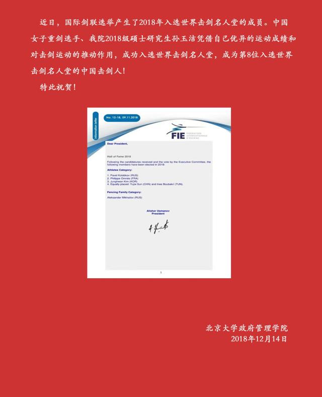 祝贺我院孙玉洁入选国际剑联世界击剑名人堂