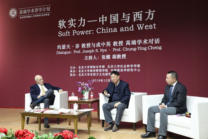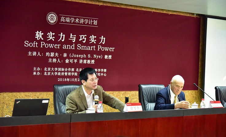 2018年10月21至22日,作为“北京大学高端学术交流计划”之一,应北京大学政府管理学院院长、中国政治学研究中心主任俞可平教授邀请,著名国际政治哲学家、哈佛大学荣休教授约瑟夫·奈(Prof. Joseph S. Nye)访问北京大学,在政府管理学院发表主题演讲,与北大学者开展座谈,并与国际著名哲学家成中英教授(Prof. Chung-Ying Cheng)举办高端学术对话。