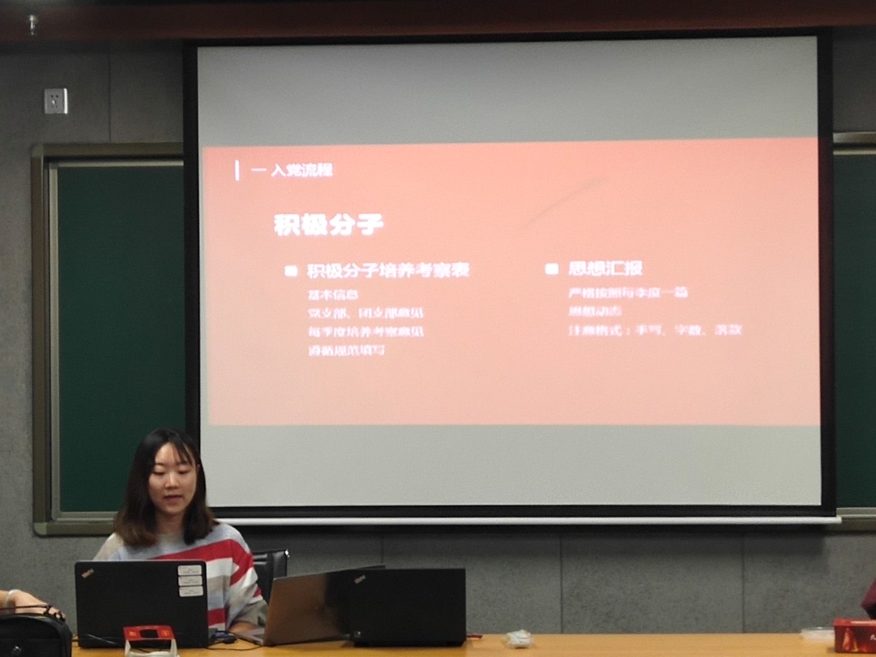 首先,本科生党支部书记吴笑葳同学以本科生党支部党员发展为例做了关于党员发展规定及流程的工作分享。