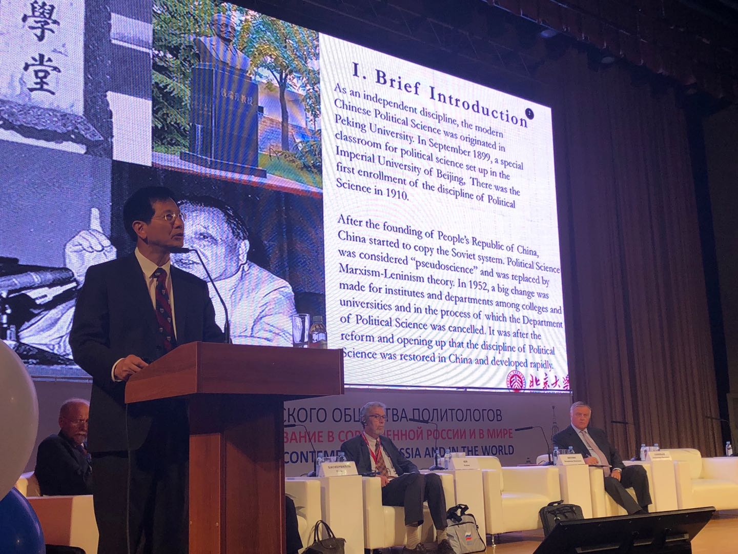 北京大学政府管理学院院长、中国政治学研究中心主任俞可平教授应邀于2018年9月9日-13日访问莫斯科大学,并作为特邀嘉宾在“第三届全俄政治学者大会”上发表主旨演讲。俄罗斯总统办公厅第一副主任基里延科、莫斯科市市长索比亚宁、俄罗斯中央选举委员会主席潘菲洛娃、莫斯科大学校长萨多夫尼奇等出席会议。同时,参加会议的还有来自35个国家的600余位政治学人。会议由萨多夫尼奇校长与亚库宁教授分别主持。大会开始前,基里延科先生还带来了俄罗斯总统普京的贺词。