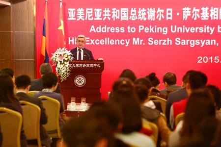3月27日上午,亚美尼亚共和国总统谢尔日•萨尔基相访问北京大学,并在英杰交流中心发表了关于《亚美尼亚外交政策》的演讲,同时被授予北京大学政治学名誉教授称号。亚美尼亚外交部部长及驻华大使等陪同来访。校党委书记朱善璐在演讲会前与萨尔基相总统举行会谈。校长林建华、中国驻亚美尼亚大使田二龙、北京大学副校长李岩松等参加了演讲会,演讲会由我院常务副院长傅军教授主持。