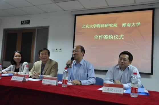 签约仪式前,两校海洋相关学科老师分别就海洋工程与科学、海洋生物资源利用与开发、海洋环境与生态保护、南海文化与法律、政策等领域科研合作进行了交流。海南大学海洋学院周永灿副院长、食品学院李从发院长、旅游学院陈扬乐副院长、土木建工学院千人汪俊峰教授、科研处黄梦醒副处长,北京大学城市与环境学院陶澍院长、工学院陈峰副院长、环境科学学院胡建信书记、政府管理学院周志忍书记、信息管理系王继民书记等分别在交流会上介绍了各自专长领域和正在开展的项目,大家认为双方在海洋工程技术、海洋生态环境与生物资源、海洋新能源与新材料、国际海洋法等方面有较大的合作潜力,希望加强交流对接,建立合作关系。