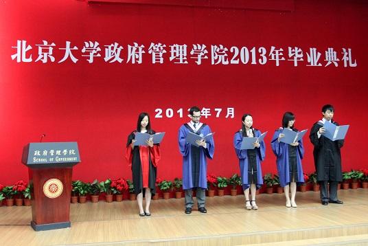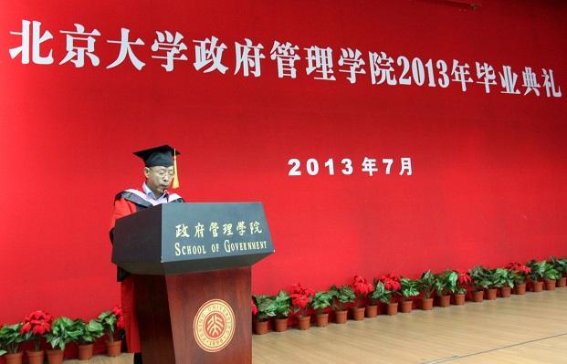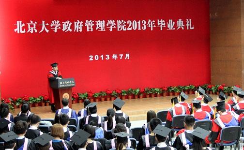 7月9日下午2:00,北京大学政府管理学院2013年毕业典礼在廖凯原楼437会议厅举行。北京大学政府管理学院院长罗豪才,党委书记周志忍,常务副院长傅军,北京大学教务部副教务长、政府管理学院学术委员会主任关海庭,政府管理学院副院长徐湘林、李国平、白智立、朱天飚、李靖,院党委副书记姚静仪等出席了典礼。参加典礼的还有学院教师代表、职工代表、部分毕业生家属以及学院2013届400余名毕业生。典礼由学院党委书记周志忍主持。