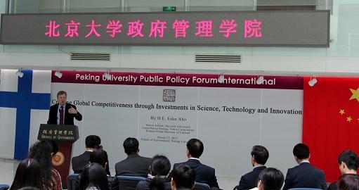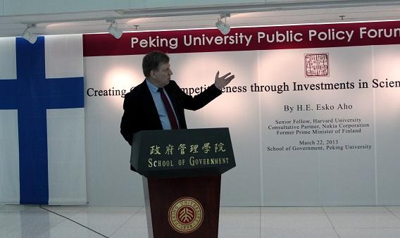 2013年3月22日上午,芬兰前总理Esko Aho阁下到访学院,与北大党委书记朱善璐教授举行了会谈,随后在学院阳光大厅发表了题为“科技、创新和全球竞争力”的演讲。演讲由政府管理学院常务副院长傅军教授主持。