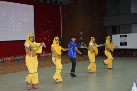 在2012级本科生米拉等少数民族同学共同表演的独具异国风情的印度舞之后,晚会拉开了序幕。学院教工舞蹈团为现场师生表演了精心编排、欢乐热烈的腰鼓舞蹈《欢聚一堂》,看到平常在办公室里为同学们服务的老师们在舞台上一板一眼的认真表演,同学们给予了长时间热烈的掌声。