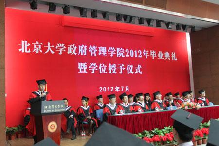 7月4日下午,北京大学政府管理学院2012年毕业典礼暨学位授予仪式在廖凯原楼437会议厅举行。北京大学政府管理学院院长罗豪才,党委书记周志忍,常务副院长傅军,北京大学校长助理、院学位委员会主席李强,北京大学副教务长关海庭,政府管理学院副院长徐湘林、李国平、白智立、李靖,院党委副书记姚静仪等出席了典礼。参加典礼的还有学院教师代表、职工代表、部分毕业生家属以及学院2012届508名毕业生,其中本科生81人;硕士生106人;博士生32人;MPA学员 289人。典礼仪式由学院党委书记周志忍主持。