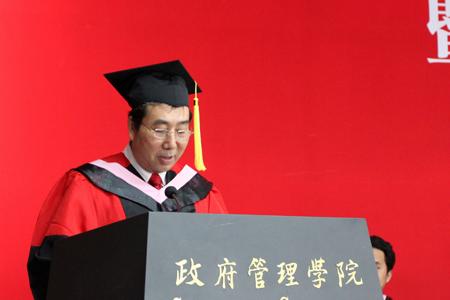 傅军发表讲话,为毕业生赠言祝福。傅军从“教育”和“领导力”两个方面展开演讲。他说,教育与灌输知识的培训不同,它的作用在于启迪智慧,向灯塔一样为求学者指引方向;北大的学子,不应该仅仅考虑个人私利,应该为人类知识边疆的拓展做出自己的贡献,做全社会的引领者。讲话最后,傅军教授提出“信念”、“毅力”、“责任”六字,并与全体师生共勉。