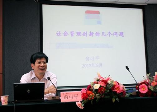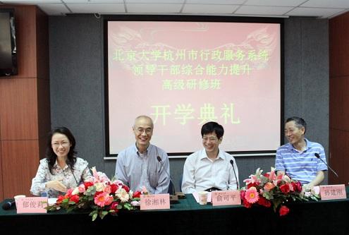 5月14日上午,杭州市行政服务系统领导干部综合能力提升高级研修班在廖凯原楼207教室举行。中共中央编译局副局长俞可平教授、政府管理学院副院长徐湘林教授、院长助理郁俊莉副教授、杭州市行政服务中心副主任孙建刚及40余名杭州市行政服务系统领导干部综合能力提升高级研修班学员参加了开学典礼。