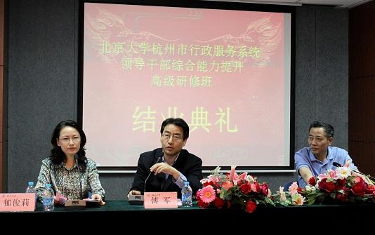 傅军常务副院长代表北京大学政府管理学院对杭州市多年的支持与协作表示衷心感谢。同时,傅军教授对学员提出了殷切的希望,希望广大学员将在课堂上所学的理论知识和分析方法运用到工作实践中,为杭州市行政服务事业的发展做出新的贡献。孙建刚副主任对政府管理学院为杭州市行政服务系统学员提供优秀的培训师资和周密的组织工作表示感谢,并表示下次干部培训仍把北京大学政府管理学院作为第一选择。学员们表示:“经过几天的北大学习,自己在实际工作中的创新意识和驾驭全局工作的能力有了一定的提升。”