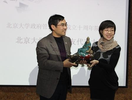 会议期间,2006级MPA校友代表河南省三门峡市湖滨区委副书记亢哲楠和2007级校友代表北京林业大学祝宝川向学院敬赠了院庆礼物,对政府管理学院十周年院庆表达诚挚的祝福。