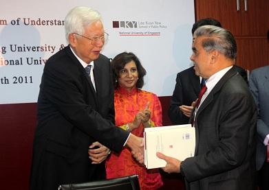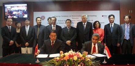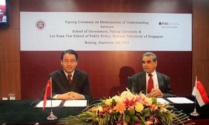 2011年9月8日,北京大学政府管理学院与新加坡国大学李光耀公共政策学院签订协议启动双硕士项目。参加签约仪式新加坡的嘉宾包括:新加坡前外交部长 George Yeo 先生,新加坡驻华大使 Chin Siat Yoon 先生,新加坡国立大学亚洲竞争力研究所主任 Tan Khee Giap ,新加坡国立大学外事负责人 Preeti Dawra ,新加坡国立大学中国销售部负责人 Adele Chen Zimmerman。中方嘉宾包括:北京大学政府管理学院院长罗豪才教授,北京大学党委副书记于鸿君教授,北京大学发展规划部常务副部长薛领,政府管理学院副院长白智立,政府管理学院副院长李靖,政府管理学院党委副书记姚静仪。政府管理学院常务副院长傅军教授和李光耀公共政策学院院长Kishore Mahbubani 教授代表双方发言并在协议上签字,签字仪式由政府管理学院副院长朱天飚主持。
