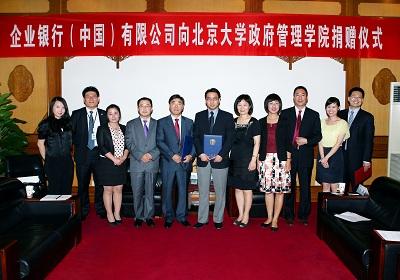 2011年6月7日下午,企业银行(中国)有限公司向北京大学政府管理学院捐赠协议签字仪式在北京大学教育基金会会议室举行。企业银行(中国)有限公司行长吴忠焕先生、副行长申成雨先生一行专程从天津赶来到访我校。北京大学校长助理、教育基金会秘书长邓娅博士,政府管理学院常务副院长、教育基金会理事傅军教授,教育基金会李榕副秘书长出席了此次活动。