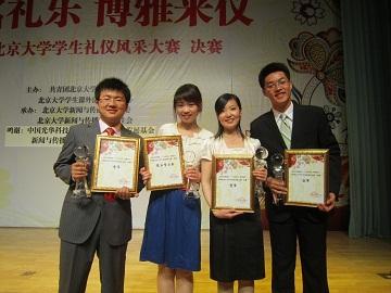 2011年5月6日晚,首届“未名礼乐?博雅来仪”北京大学学生礼仪风采大赛在百年讲堂多功能厅落下帷幕。大赛分为“风采展示”、“情景模拟”、“复活拉票”、“PK环节”等多个比赛环节。在比赛中,我院10级本科生李春晓在比赛中披荆斩棘,在14名进入决赛的选手中脱颖而出,最终获得了季军。