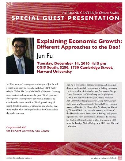 2010年12月14日,北大政府管理学院傅军教授应邀在哈佛大学进行专场演讲,畅谈各国财富增长之“道”,其中特别谈及中国经济发展的历史、现在和将来, 此主题在世界经济前景不明朗和中国实施“十二五”规划之际变得尤为重要。财富到底是什么?其增长的深层动力是什么?人类思想、制度和文化环境之间的关系是什么?与经济效率的关系又是什么?能用函数来表达吗?其中所含的假说可以证实或证伪吗?中国经济发展与人类经验的内在逻辑有共性吗?其特殊性又体现为什么?对“道”的不同解释对回答这些问题又有什么启示?展望未来,世界经济和中国经济面临的挑战又是什么?有什么不同?为什么?爱因斯坦说“如果你不能简单地解释事物时,说明你离真理还很远”,自然科学研究的科学性对社会科学有什么启示?傅军教授演讲的题目为"Explaining Economic Growth: Different Approaches to the Dao?”, 演讲内容主要基于其发表的专著《国富之道》,此书在去年底发表后迅速成为畅销学术专著。此场专题演讲会由哈佛大学亚洲中心和费正清研究中心联合举办。