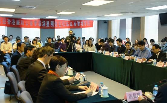 廉政公署一行介绍了廉署的历史、使命以及执法、教育、预防三管齐下,肃贪倡廉的经验。在谈到香港廉政公署在廉政文化建设中的经验时,他们强调应针对不同的社会群体,采用多元化的手段使得廉政的理念能够深入人心。比如,开办定期的培训班、研讨会;与媒体合作,扩大宣传;透过互联网,发布廉政资料,保持与社会各个阶层的沟通。