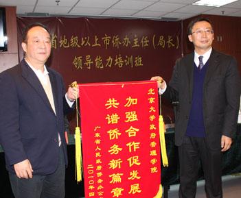 4月22日,广东省地级以上市侨办主任(局长)领导能力培训班结业典礼在北京大学廖凯原楼207室举行。北京大学政府管理学院院长罗豪才教授,副院长李国平教授,广东省侨办主任吴锐成等领导以及全体学员参加结业典礼。