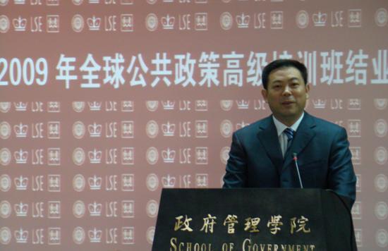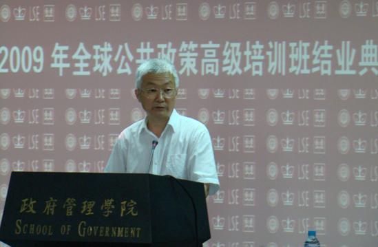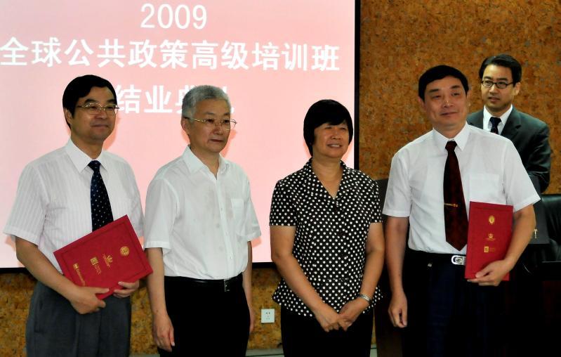 2009全球公共政策高级培训班 于7月31日上午在政府管理学院廖凯原楼院圆满闭幕。我国54位中央和地方的厅局级干部学员和6位新加坡学员结束了为期2个月的培训。中组部干教局副巡视员李桂春,北京大学党委副书记杨河,政府管理学院常务副院长傅军和英国伦敦政治经济学院驻中国代表Brendan Smith参加了结业典礼。闭幕式由北京大学政府管理学院副院长李靖主持。