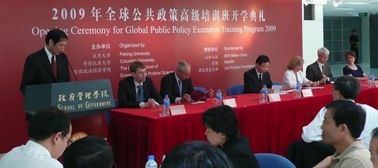 “全球公共政策高级培训班项目”由北京大学政府管理学院、美国哥伦比亚大学国际与公共事务学院、英国伦敦经济学院、法国巴黎政治学院等世界一流学府联合举办,该项目旨在丰富我国领导干部经济和公共管理知识、开拓国际视野、拓宽分析和解决问题的思路、从而进一步提高公共管理能力、战略思维能力和国际交往能力。项目开设《经济学与公共政策》、《公共政策与法律》、《政治学与公共政策》、《公共政策分析方法》、《公共政策和管理》、《善治和可持续发展》、《公共政策与技术创新》和《中国改革和世界经济》等核心课程,由北京大学政府管理学院、美国哥伦比亚大学国际与公共事务学院、英国伦敦经济学院、法国巴黎政治学院的教授联合授课。学员完成所有课程后,将获得由四所大学联合签发的证书。据悉,本期学员有54位我国中央和地方的厅局级领导干部,还有来自新加坡总理办公室、外交部等部门的6名外国官员。