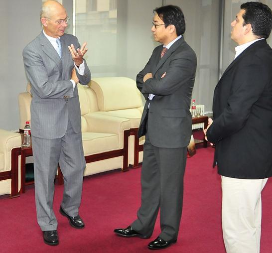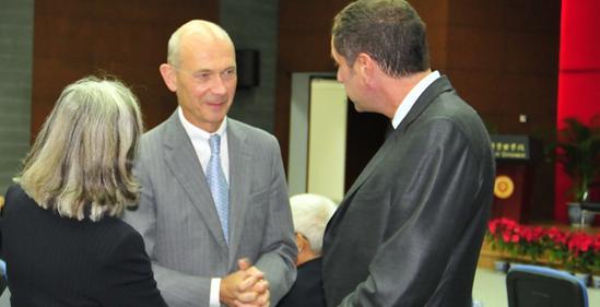 WTO总干事拉米先生(中)与法国巴黎政治学院教授(左)和校长(右)会前交谈