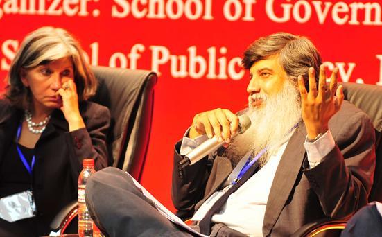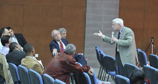 北京大学政府管理学院常务副院长傅军教授(中)与参会嘉宾交谈