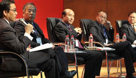 从左至右:中国银监会副主席王兆星,英国前金融监管局局长、伦敦政治经济学院院长Howard Davies,欧洲委员会经济和金融事务总干事Klaus Regling,北大光华管理学院院长张维迎在“全球金融体系”论坛上