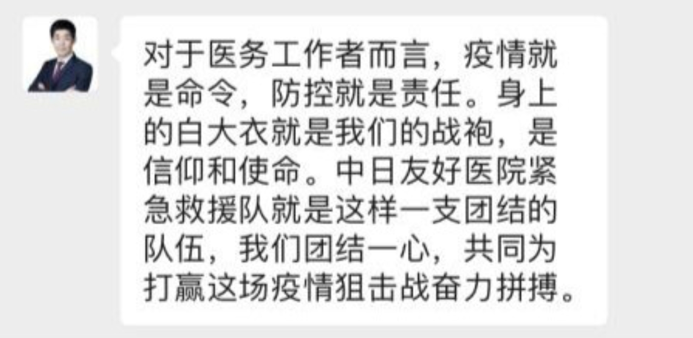 得知王燕森参加了援鄂医疗队,并肩负重任时,学院第一时间联系他,希望更多了解他的情况,了解抗疫前线的情况。微信发去了,短信发去了,久久没有回音。直到夜深了,王燕森才回信,语言那么朴实简单却真挚:“谢谢老师们的关心。我在前方挺好的。我会注意防护好。另外,这是我作为医生应该做的,没有什么值得采访的。这时候需要医务人员,武汉需要我们卫生国家队,能够参加援鄂抗疫是我们医务人员的职责所系,更是珍视一生的光荣。”