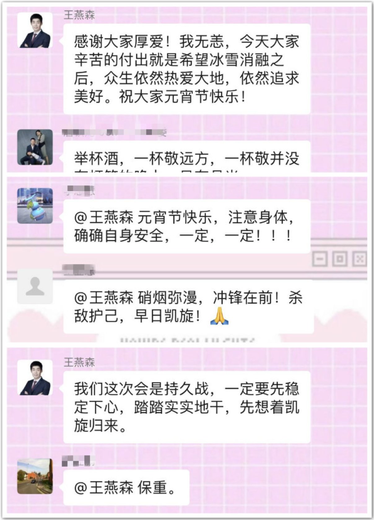 抗疫工作辛苦而危险,但人间的真情总能温暖医疗工作者疲惫的心。无论是武汉人民对于医疗队的感恩和感谢,或者医务人员的无私奉献和付出,还有社会各界对于武汉一线的支持,都给王燕森留下了极其深刻的印象。面对学院老师同学们对他的关心和鼓励,王燕森利用少有的休息时间尽可能回复,安抚大家的紧张情绪。他表示一定会做好个人防护,努力带队完成好抗击疫情工作,早日平安回家。