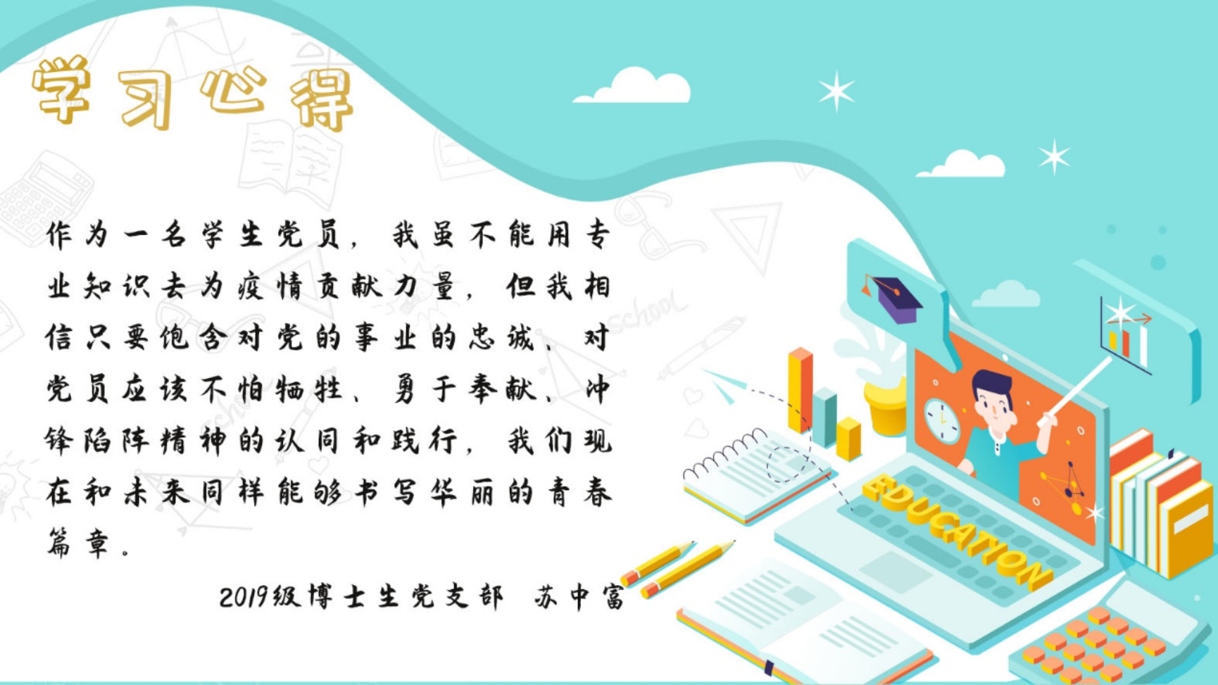2月29日至3月5日,2019级博士生党团支部联合开展了主题为“我们都是收信者,我们争做圆梦人”回信精神线上学习周活动。在为期6天的学习中,支部成员共同学习讨论了《习近平给在首钢医院实习的西藏大学医学院学生的回信》、习近平总书记在统筹推进新冠肺炎疫情防控和经济社会发展工作部署会议上的讲话、习近平总书记在北京考察新冠肺炎防控科研攻关工作时的讲话、“60分贝暖医”江学庆医生的感人事迹、武汉战“疫”中各位平凡英雄的事迹等。在主题学习周里,党团支部成员结合自身经历深入学习探讨,对回信精神的理解程度日渐加深。同时,支部成员们受到感人事迹鼓舞,纷纷致敬各位坚守者,致敬各位奉献者,更致敬并缅怀为抗击疫情而献出生命的逆行者。