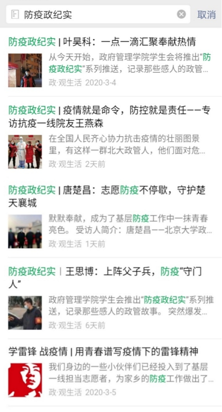 在这次抗疫战斗中,北大政管人未曾缺席。学院学生会积极开展工作,挖掘政管人深入基层抗击疫情的典型事迹,在学院官方公众号上推出“防疫政纪实”系列推送,宣传他们的抗疫身影,以及行动背后对总书记回信精神的践行,从而使总书记回信精神触动更多人的心灵。