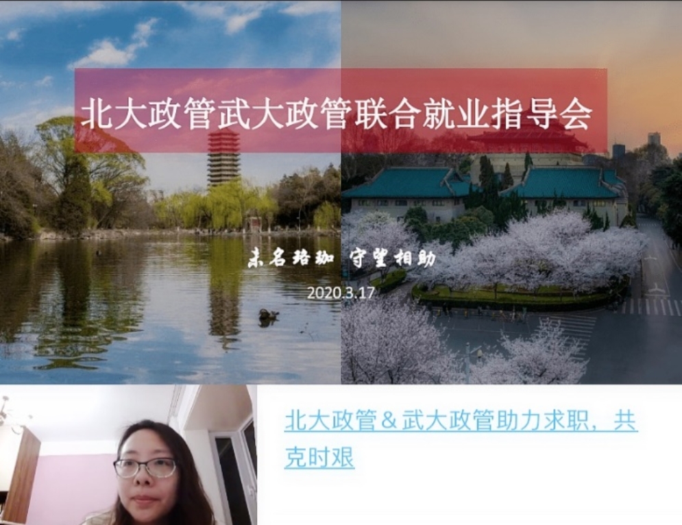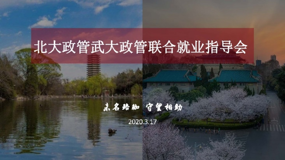 前言:近日,习近平总书记给北京大学援鄂医疗队全体“90后”党员的回信引起热烈反响,总书记在信中寄语青年“希望你们努力在为人民服务中茁壮成长”,“让青春在党和人民最需要的地方绽放绚丽之花”。政管学子一向秉持“天下为公,报国为怀”的志向,每年都有一大批毕业生投身公共服务,但抗击疫情期间,同学们的求职就业难免受到影响。“未名珞珈,山水共色。京城江城,风雨同舟”,为解决同学就业难题,深化院际交流合作,更为将总书记回信精神入脑入心,落到实处,引导同学们在求职就业的过程中体悟、践行回信精神。在学院和中公教育集团的大力支持下,北京大学政府管理学院研究生会携手武汉大学政治与公共管理学院研究生会,策划实施了本次线上联合就业指导会,以回信精神指引同学,以实际行动帮助同学,助力两院学子顺利求职。