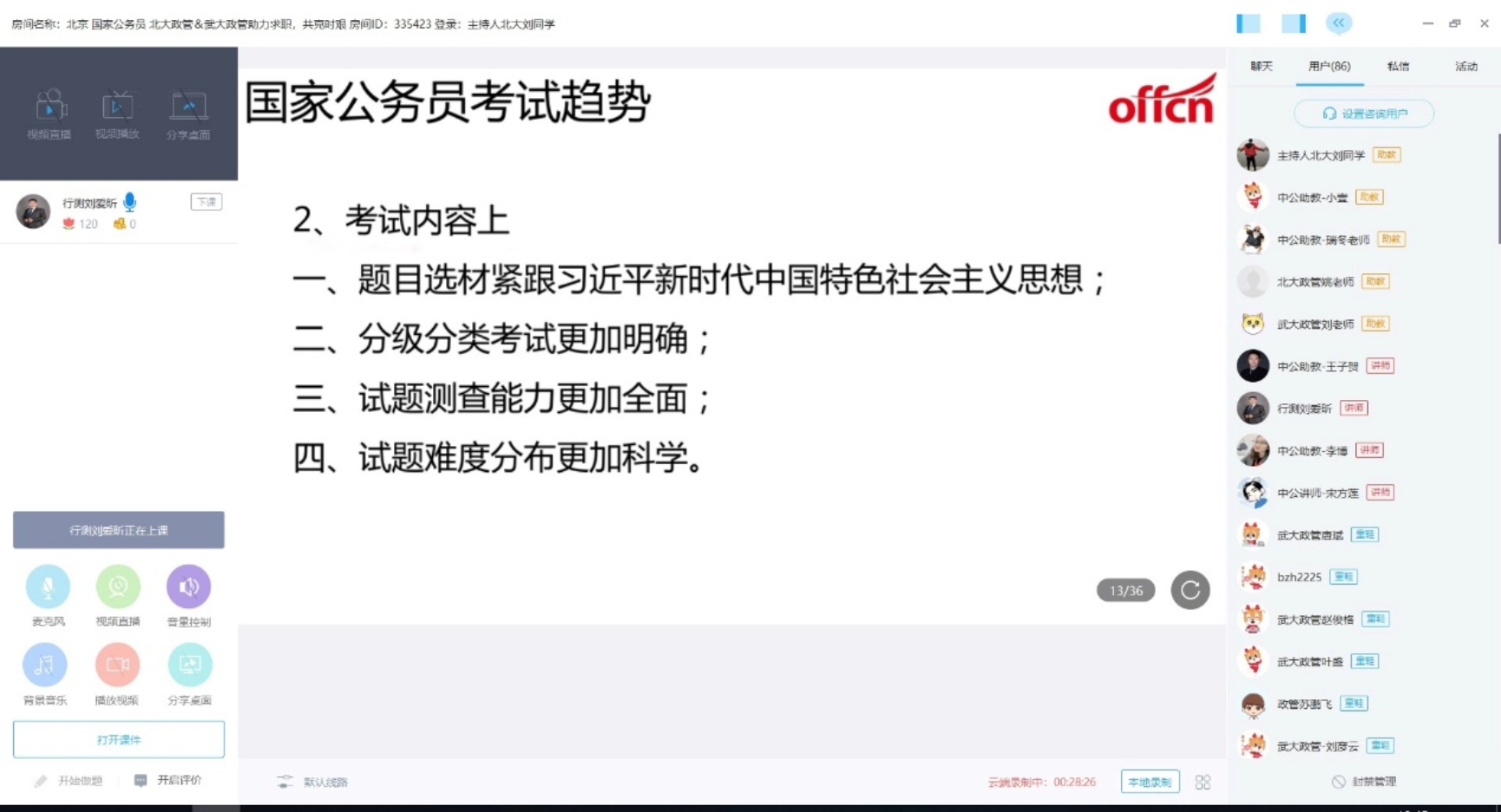 两位老师致辞结束后,中公教育集团刘爱昕老师为同学们做就业指导。刘老师从就业选择、备考准备两方面展开,从职业发展、人生规划、工作性质、福利待遇四个方面着重剖析了求职动机,并以此次奋战在抗疫一线的基层榜样为例,认为受他们感召,未来将会有更多有志青年向两院政管学子一样,投身公共服务。接着,刘老师比较分析了国家公务员、省市公务员、军队文职、事业单位、国有企业各类工作的性质特点和人岗需求,并有针对性地给出备考建议。讲解结束后,刘老师就同学们关心的问题实时互动,答疑解惑。