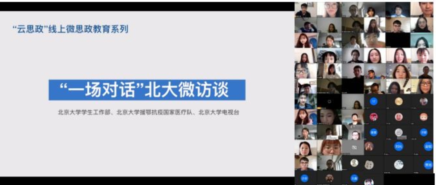 班会的最后,同学们在线合影留念,并一同观看了连线北大援鄂国家医疗队“90后”党员的微访谈视频,进一步深化了对于习近平总书记回信的精神的理解。