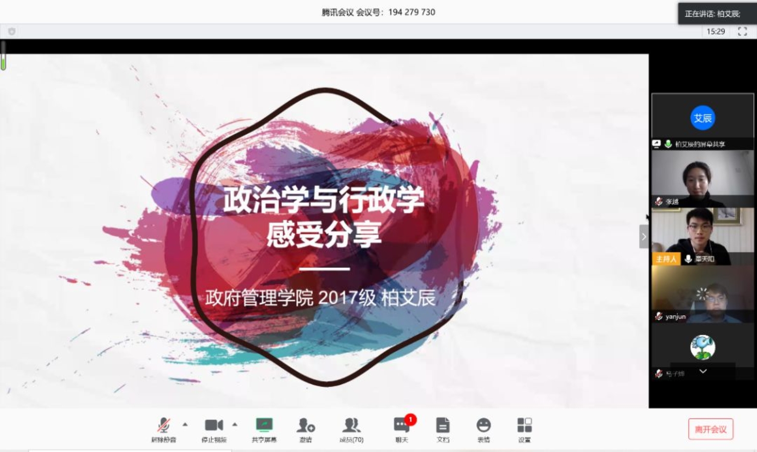 政治学与行政学方向的柏艾辰从“学什么”、“为什么学”、“怎么学”三个方面向同学们阐述了自己对专业学习的思考。她提出,政治学的学习能帮助同学们拥有更加广阔的思维能力,对现实的理解和决策拥有更好的指导意义。希望大家能够综合分析自己的兴趣偏好及职业规划,多学习、多思考,做出理性的选择和决策。