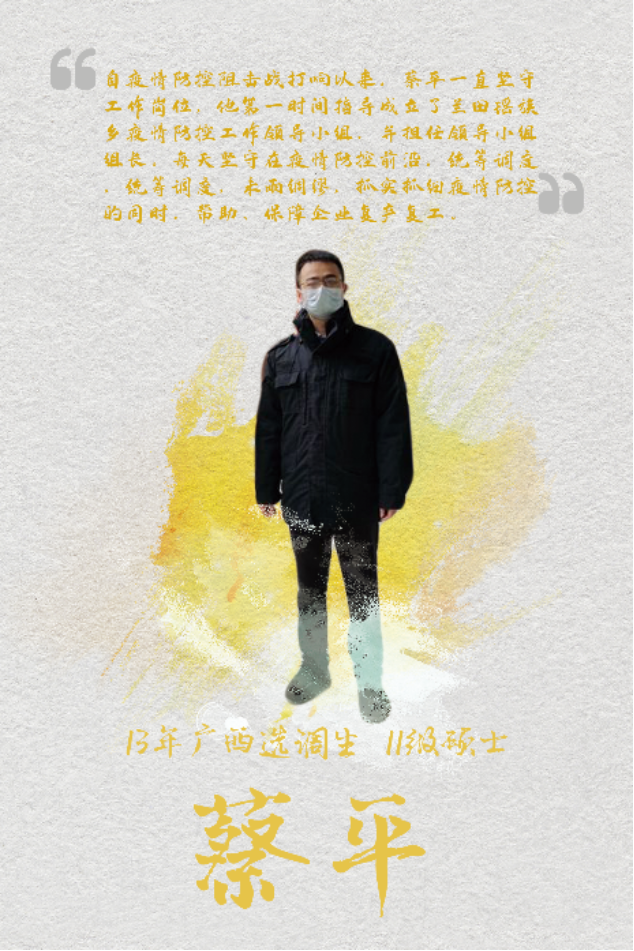 自疫情防控阻击战打响以来,蔡平一直坚守工作岗位,以实际行动践初心、担使命,带领兰田瑶族乡广大党员干部群众共同筑牢抗击疫情的“防护墙”,形成了党建引领、党员冲锋、众志成城的强大防控合力,守护一方。