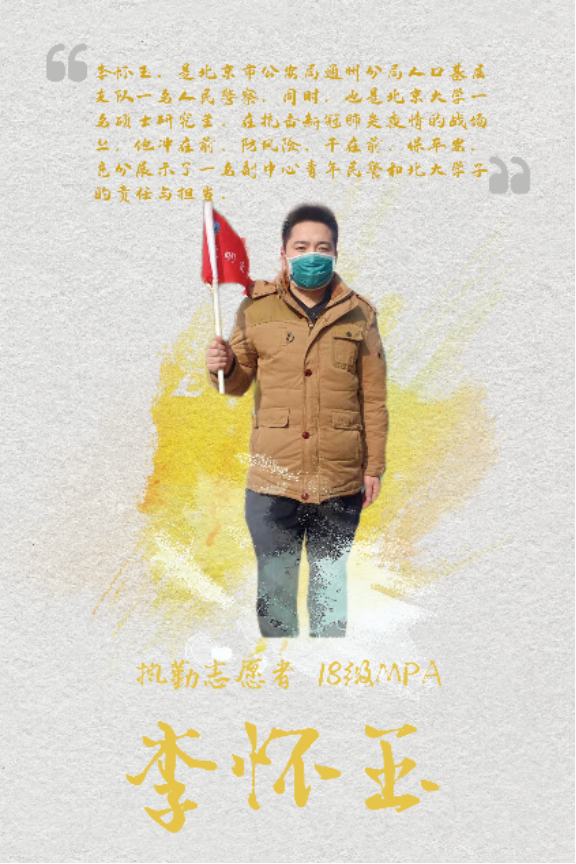 李怀玉,是北京市公安局通州分局人口基层支队一名人民警察,同时,也是北京大学一名硕士研究生。在抗击新冠肺炎疫情的战场上,他冲在前、防风险、干在前、保平安,充分展示了一名副中心青年民警和北大学子的责任与担当。