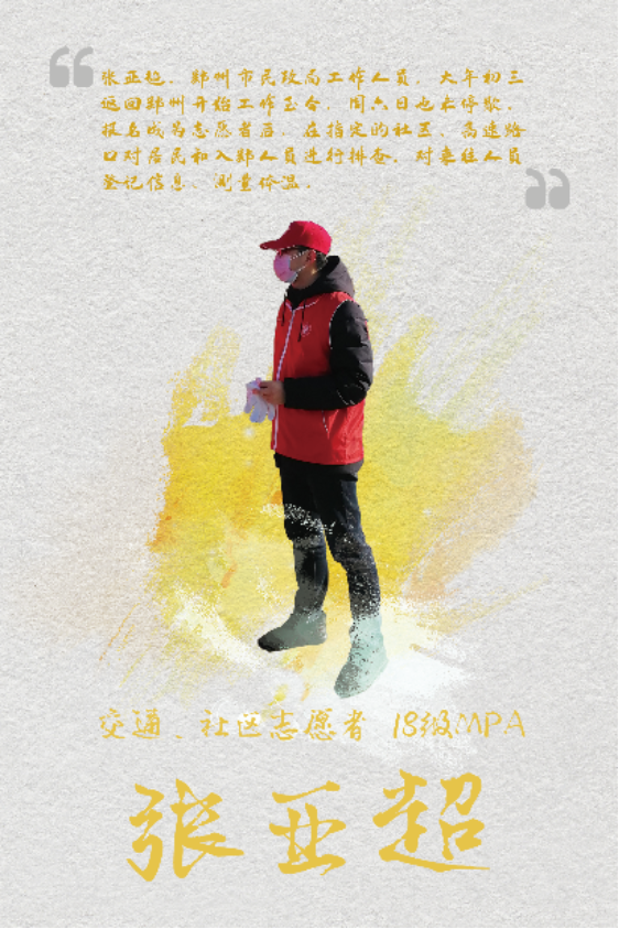 张亚超,郑州市民政局工作人员,18级MPA。大年初三返回郑州开始工作至今,周六日也未停歇。报名成为志愿者后,在指定的社区、高速路口对居民和入郑人员进行排查,对来往人员登记信息、测量体温。这些工作都需要近距离密切接触大量未知健康状况的人员,特别是有些被排查对象或因为思想大意、或因为情绪问题,不认真佩戴口罩、不愿意服从管理,还需要循循善诱,耐心予以劝说。在所有人的共同努力下,疫情终于被遏制住,为国家、为每一个默默付出的平凡人感到骄傲!