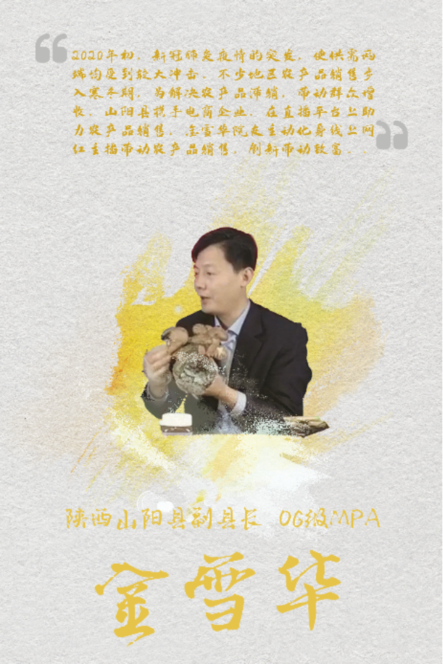 2020年初,新冠肺炎疫情的突发,使供需两端均受到较大冲击。在不少地区农产品销售步入寒冬期之时,金雪华院友主动化身线上网红主播,通过网络直播的形式为山阳县农产品代言,亲切热情的形象既给农产品带来了热销,也引来了网友们的纷纷点赞。