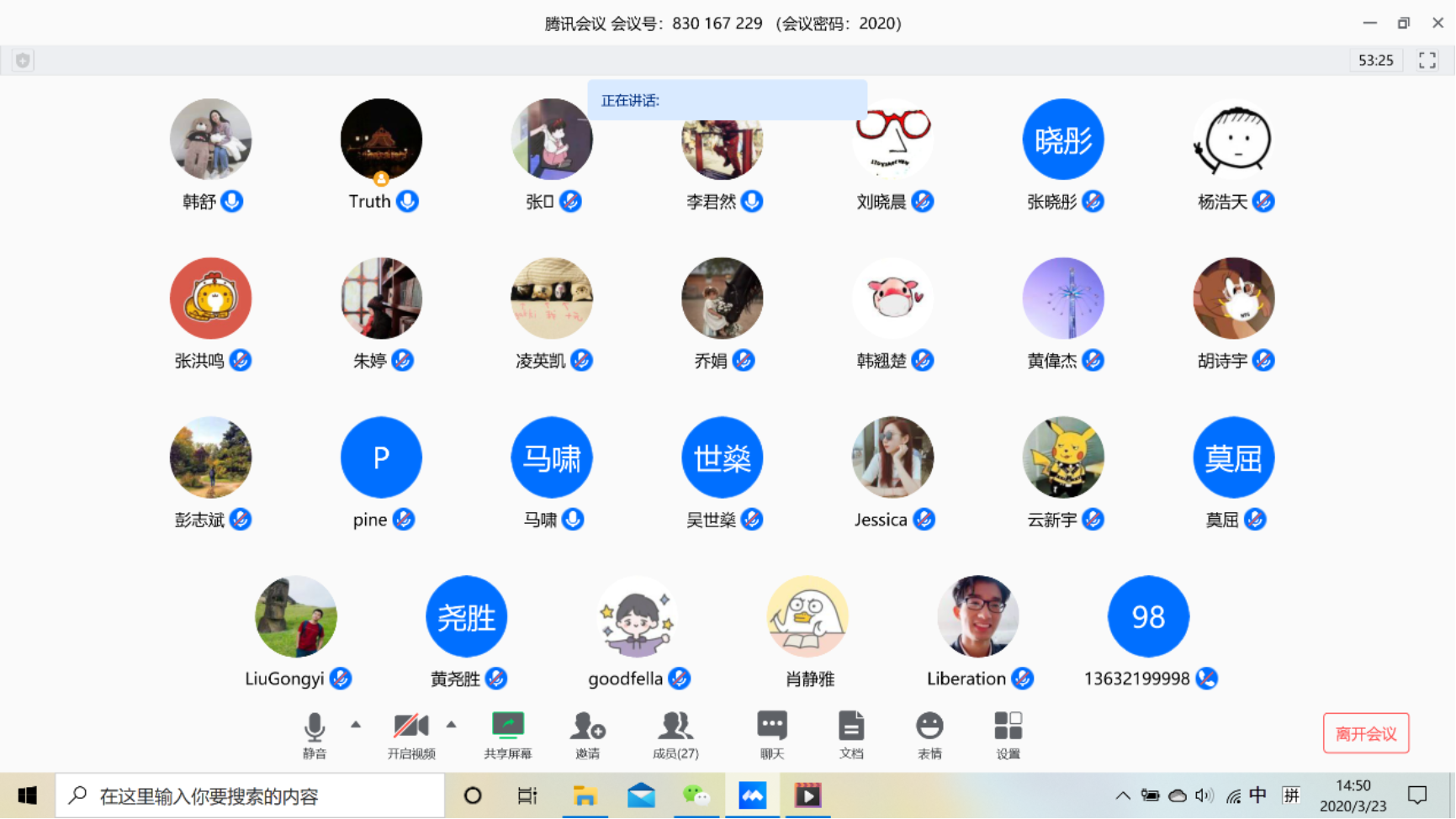首先,班长韩舒向大家展示了由同学们提供的生活照片制作成的视频,其中既有祖国各地春色,也有居家学习小景。之后,同学们分享了近期自己的学习与生活感受。求是、韩翘楚、张晓彤、刘晓晨、胡诗宇、云新宇、吴世燊、杨浩天、黄伟杰、凌英凯、莫屈等同学积极发言。其中,来自台湾的黄伟杰同学向大家展示了海峡另一岸的抗疫行动,寒假留校至今的刘晓晨则描绘了燕园的生活细节。大家真诚祝愿各地各国战胜疫情,期待早日回到学校同窗共学。